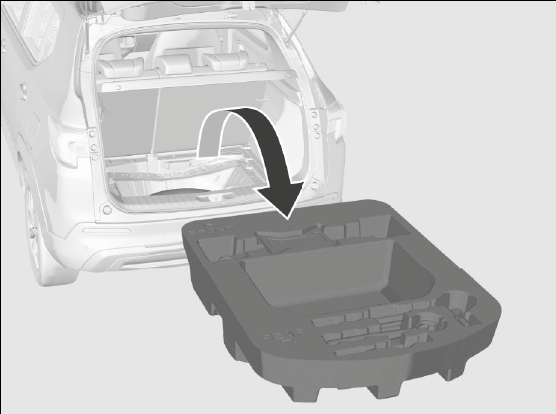 [3] Retire o gancho para reboque e a chave de roda do compartimento de bagagem.