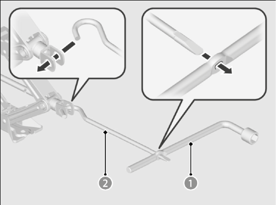 [3] Levante o veículo, usando a barra da alavanca do macaco e a chave de roda como alavanca, até que o pneu esteja fora do chão.