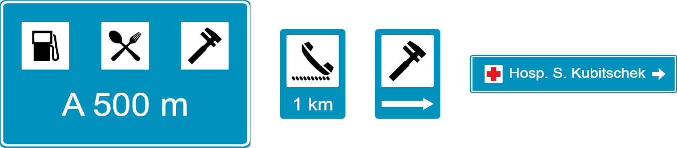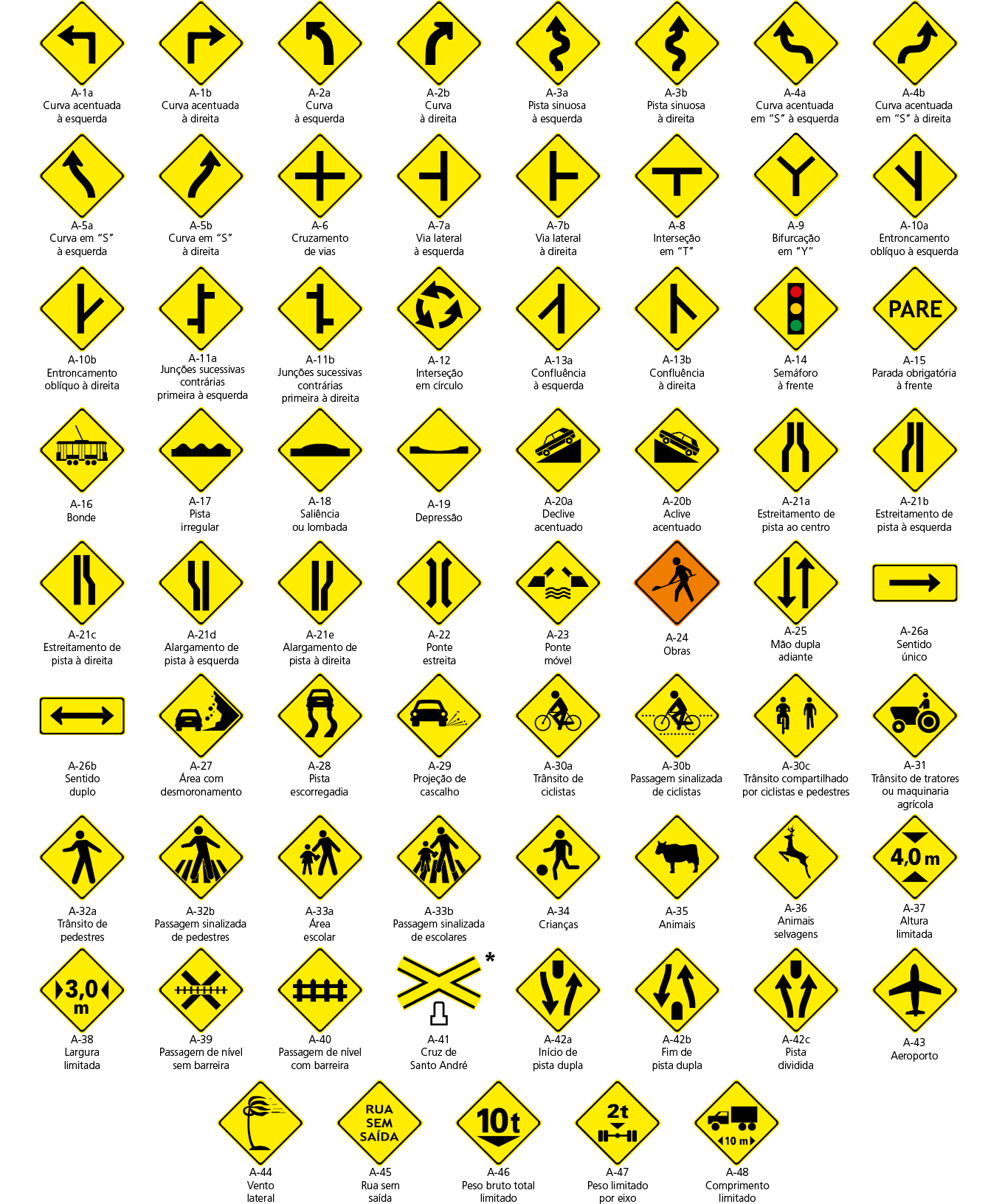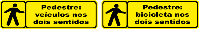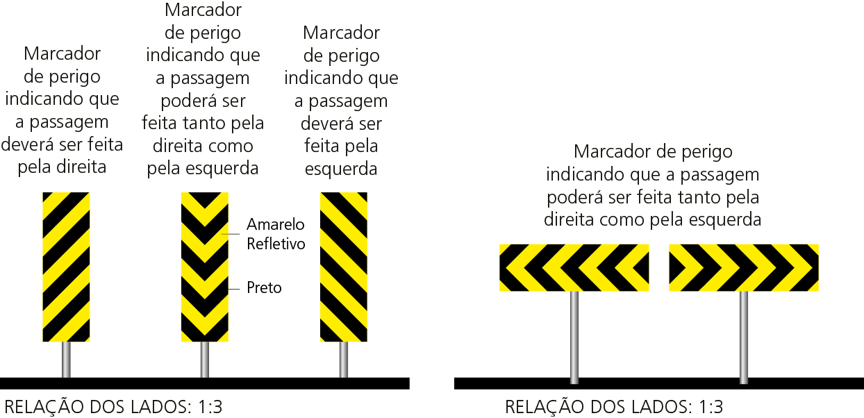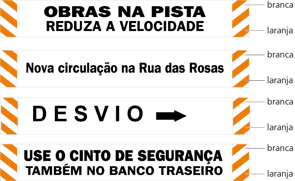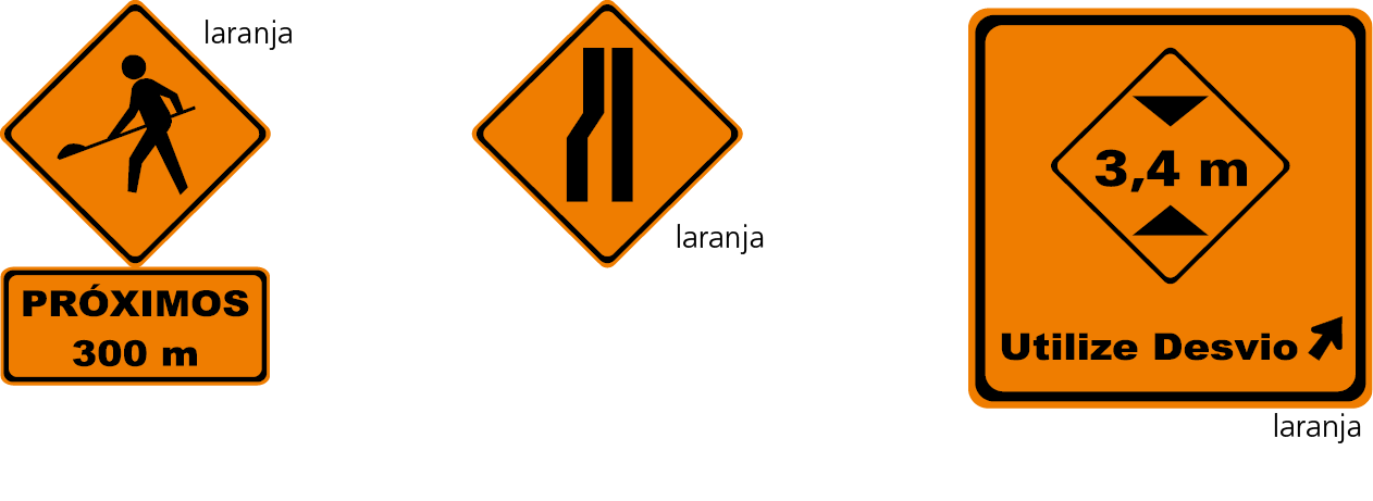 A sinalização vertical de advertência e as placas de orientação de destino adquirem características próprias de cor, sendo adotadas as combinações das cores laranja e preta. Entretanto, mantém as características de forma, dimensões, símbolos e padrões alfanuméricos: