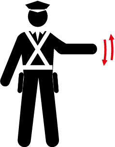 Ordem de parada obrigatória para todos os veículos que venham de direções que cortem ortogonalmente a direção indicada pelo braço estendido, qualquer que seja o sentido de seu deslocamento. |